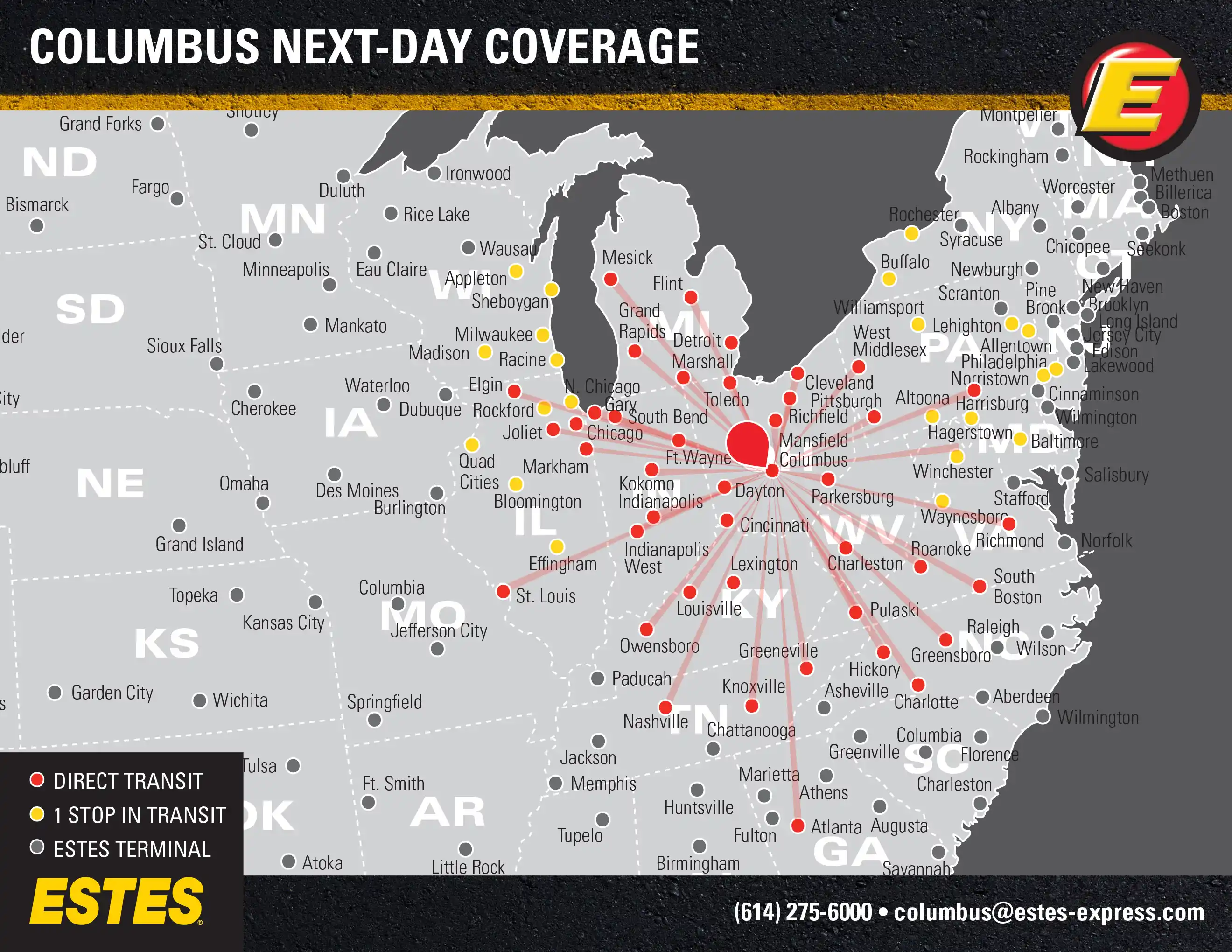 Estes offers next-day direct LTL freight shipping from Columbus to Chicago, Atlanta, Charlotte, Indianapolis, Nashville, Cleveland, Cincinnati, Pittsburgh, Detroit, St. Louis, Lexington, and Louisville, as well as next-day LTL to Philadelphia, Toronto, Milwaukee, Baltimore, and more. Learn about the benefits of shipping through this hub terminal.