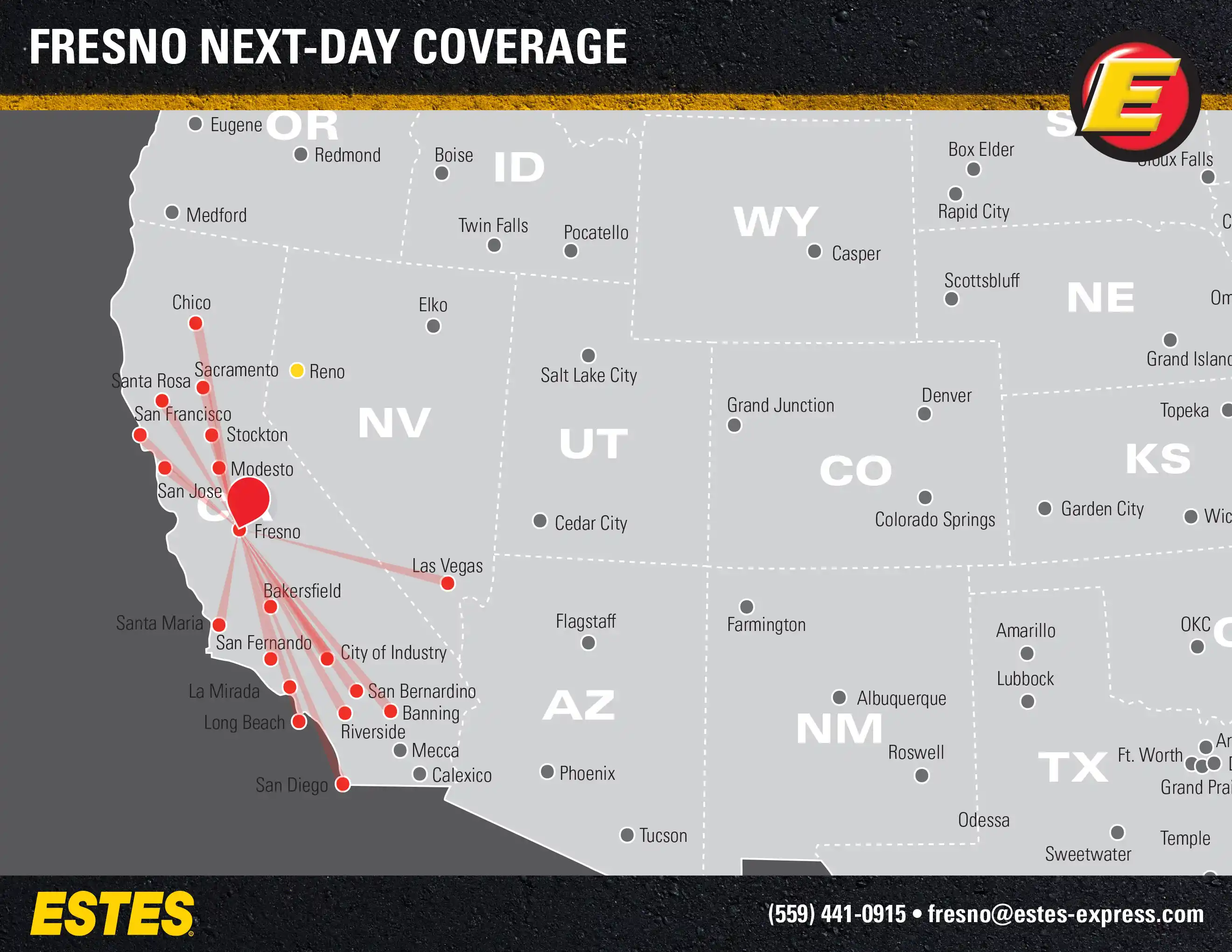 Estes offers next-day direct LTL freight shipping from the Fresno-Visalia-Clovis area to Los Angeles, San Francisco, San Diego, Las Vegas, San Jose, Sacramento, San Bernardino, Riverside, Bakersfield, Chico, Stockton, Modesto, and more, as well as next-day LTL to Reno. Learn about the benefits of shipping through this hub terminal.