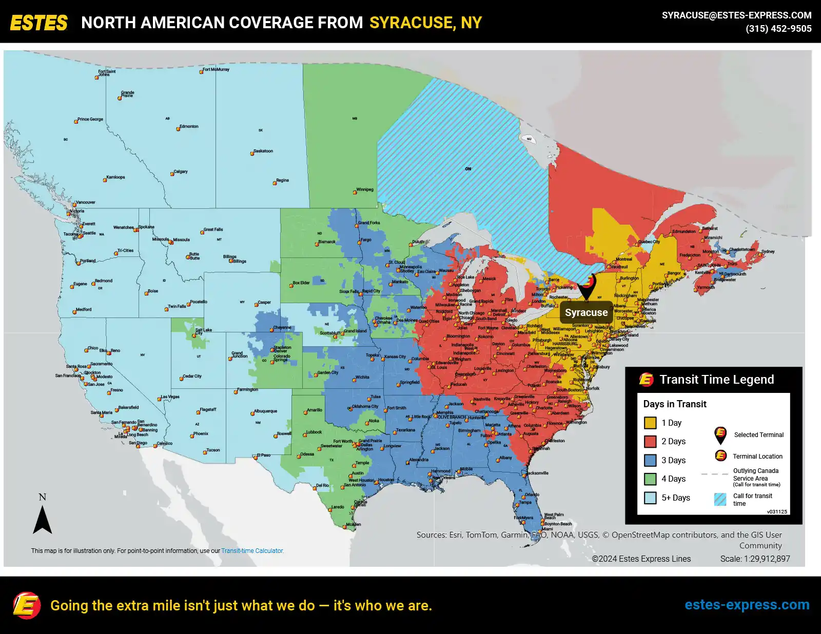 Estes also offers reliable next-day LTL shipping from the Syracuse to Toronto and Montreal—supported by our nationwide team of Border Concierges and featuring some of the best freeze protection in the industry!